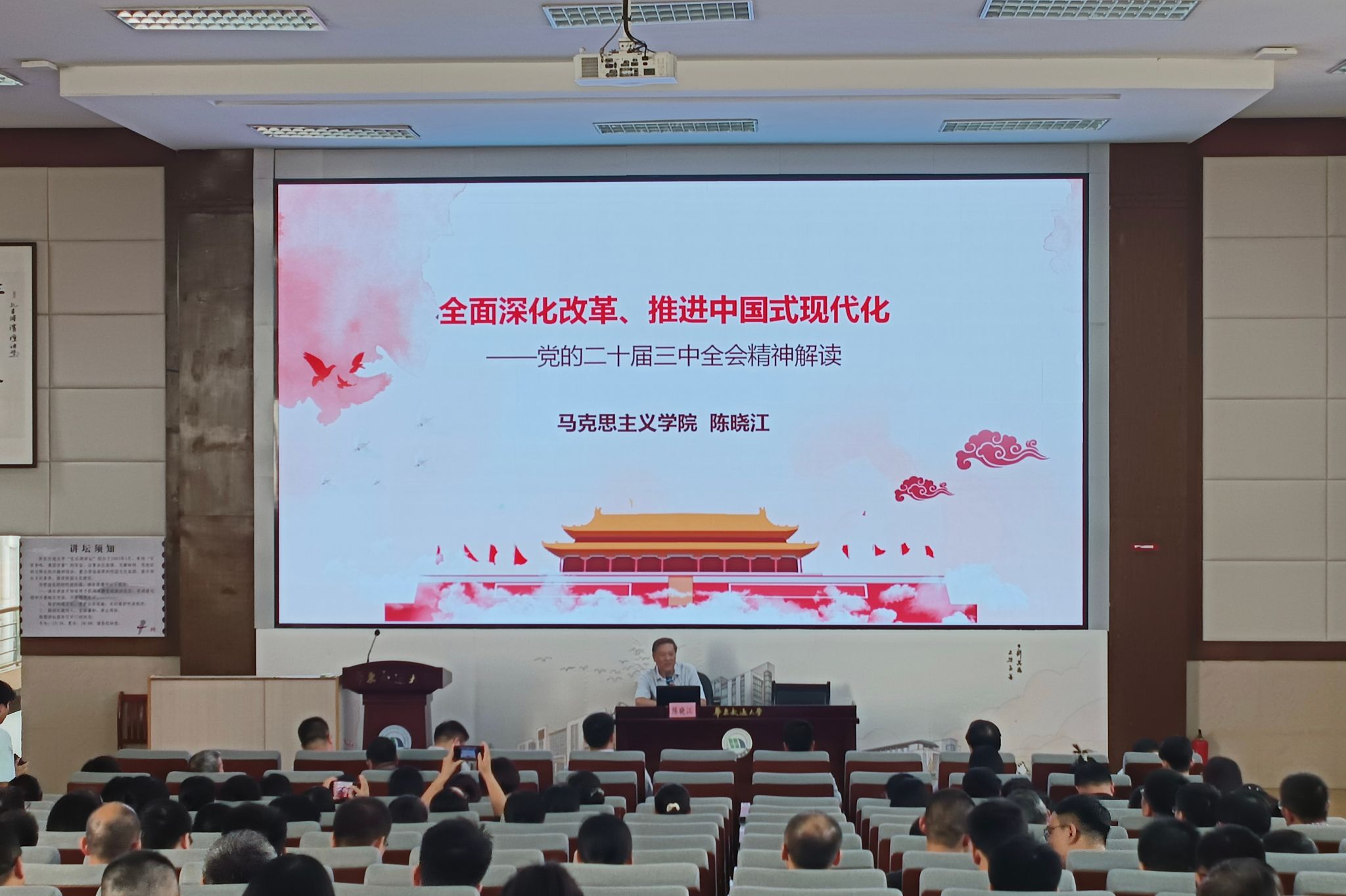 学习贯彻党的二十届三中全会精神宣讲报告会在南区图书馆202孔目湖讲坛举行。校宣讲团成员、马克思主义学院陈晓江教授应邀作宣讲。学院党委书记魏永峰主持会议,学院领导班子成员、全体教职工参加会议。