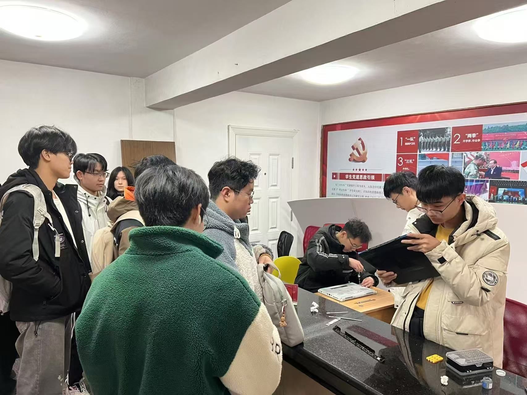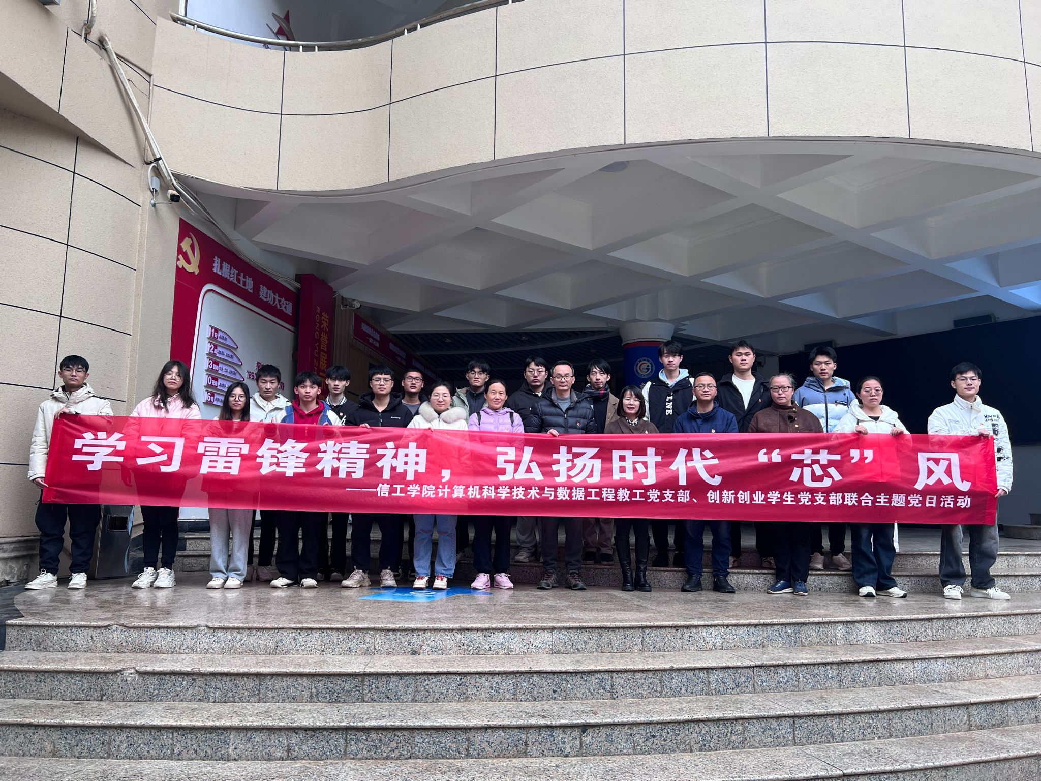 计算机科学技术与数据工程教工党支部联合创新创业学生党支部在南区一站式服务中心开展“学习雷锋精神,弘扬时代‘芯’风”主题党日活动,为全校师生提供计算机系统重装、硬件检测、病毒查杀等技术服务。