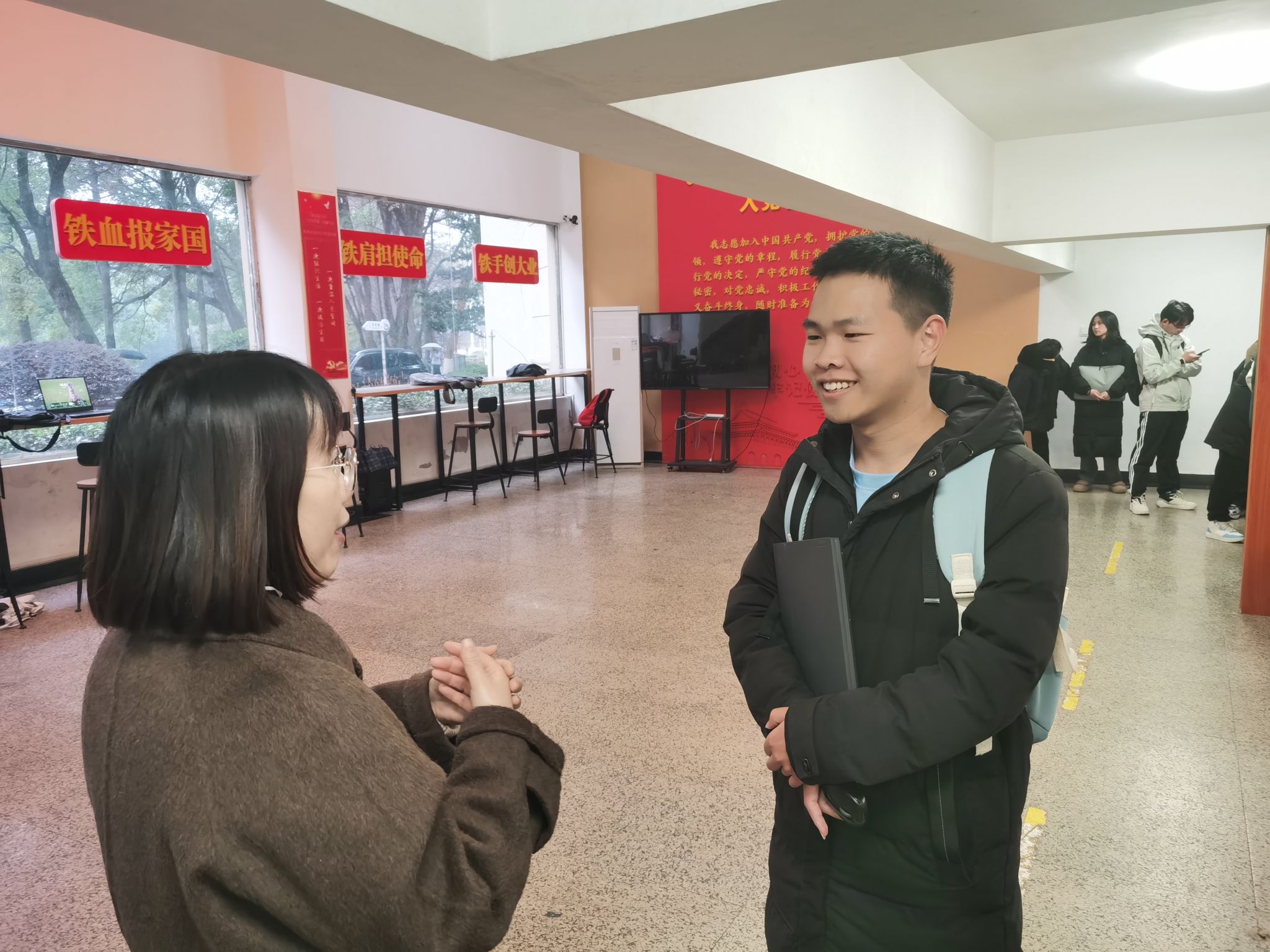 创新创业学生党支部黄芳与前来体验服务的同学交谈