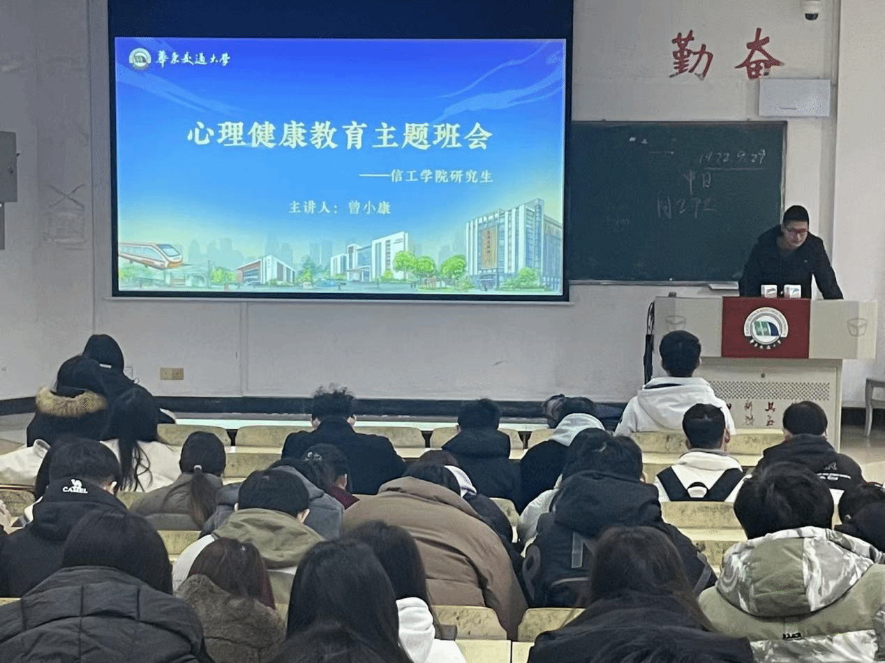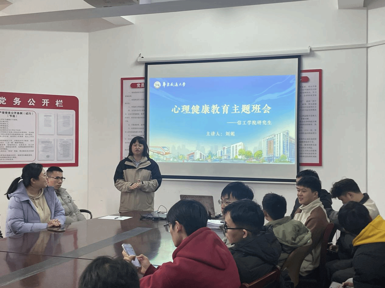 辅导员刘妮根据研工部和心理教育中心的工作安排,布置了2023级研究生线上心理测试任务,并围绕“研究生常见的一般心理问题”、“压力应对方式探讨”等主题展开班会。会上,她通过通俗易懂的实际案例,引导大家如何识别和解决心理问题,同时鼓励大家正视压力的存在,学会合理排解,积极与老师、同学或朋友分享自己的感受。最后,刘妮详细介绍了学校心理教育中心的预约方式,鼓励大家在遇到心理困扰时主动寻求帮助。