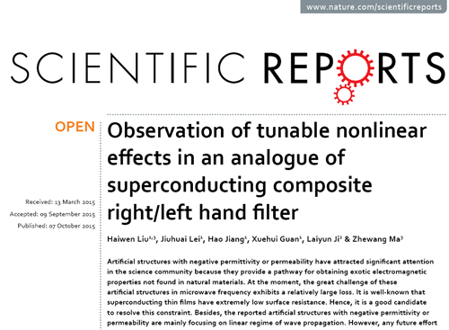 10月7日,我校信息学院射频通信与传感器网络江西省重点实验室,在高温超导超材料非线性效应研究领域的一项重要研究成果,被英国Nature出版集团《ScientificReports》期刊在线发表,论文题目是《Observationoftunablenonlineareffectsinananalogueofsuperconductingcompositeright/lefthandfilter》。我校副校长刘海文教授,信息学院官雪辉博士和日本埼玉大学马哲旺教授,天津海泰超导公司季来运研究员是本篇论文的共同通讯作者,硕士生雷久淮和蒋浩是本论文的学生作者,69成人小说