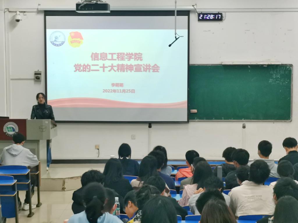 为学习宣传贯彻党的二十大精神,进一步提高团支书的思想意识。11月25日,信息学院召开党的二十大精神宣讲会,信息学院学工办副主任兼团委副书记李萌萌主讲,全院团支书参加宣讲会。