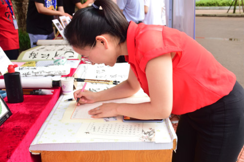 “快看快看!这里有汉服的展览!好好看啊!”“哇,这些刺绣太漂亮了吧!” 文化馆前,十几名同学在此驻足观赏。精致摇曳的汉服、描龙绣凤的刺绣、巧夺天工的剪纸、笔墨横姿的书法,一样接一样,夺人眼球,引得同学们在观赏之余连连发出感慨。除了直接观赏展品,参与者也能直接拿起毛笔,在宣纸上写下“花椒博物馆”五字。