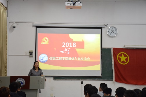 为激发信息学子的政治热情, 增强共青团组织的凝聚力和吸引力,4月13日,信息学院于逸夫楼114召开推优入党交流会。信息学院学工办副主任兼团委副书记杨青和院学生会副主席肖佳豪出席本次大会。各班被推优同学与会。