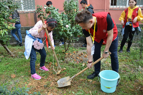 锄头、铁锹、水桶、树苗......各项物料一应俱全,经分组分工后,志愿者和孩子们便为小树苗安起了家。伴着骄阳,志愿者们卖力地挖坑、铲土,孩子们则帮忙扶正树苗、填土压土、提水浇水。虽然活动无声,却也有条不紊,孩子们悉心关照着自己的树苗,生怕这儿土没填平、那儿水没浇够,不放过一丝细节。一株株小树苗在志愿者和孩子们的共同努力下焕发出新的生机,为温馨的校园增添了一抹绿色。