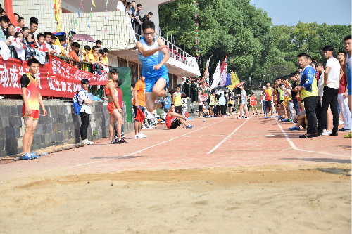 拥挤的人群中间,两个身着蔚蓝色运动服的队员在沙坑上方飞跃着,一次又一次博来众彩。他们正是信息学院的运动健儿周子文、李璋培。只见周子文从远处飞奔而来,每一跳都达到极致,第一跳,释放出积蓄的力量;第二跳,跨出信息学子腾飞的梦想;第三跳,展开了有力的翅膀。最后他纵身腾飞在空中。落地的瞬间,沙坑中飞溅的黄沙与周子文一起,成了今天田径场上最完美的构图。