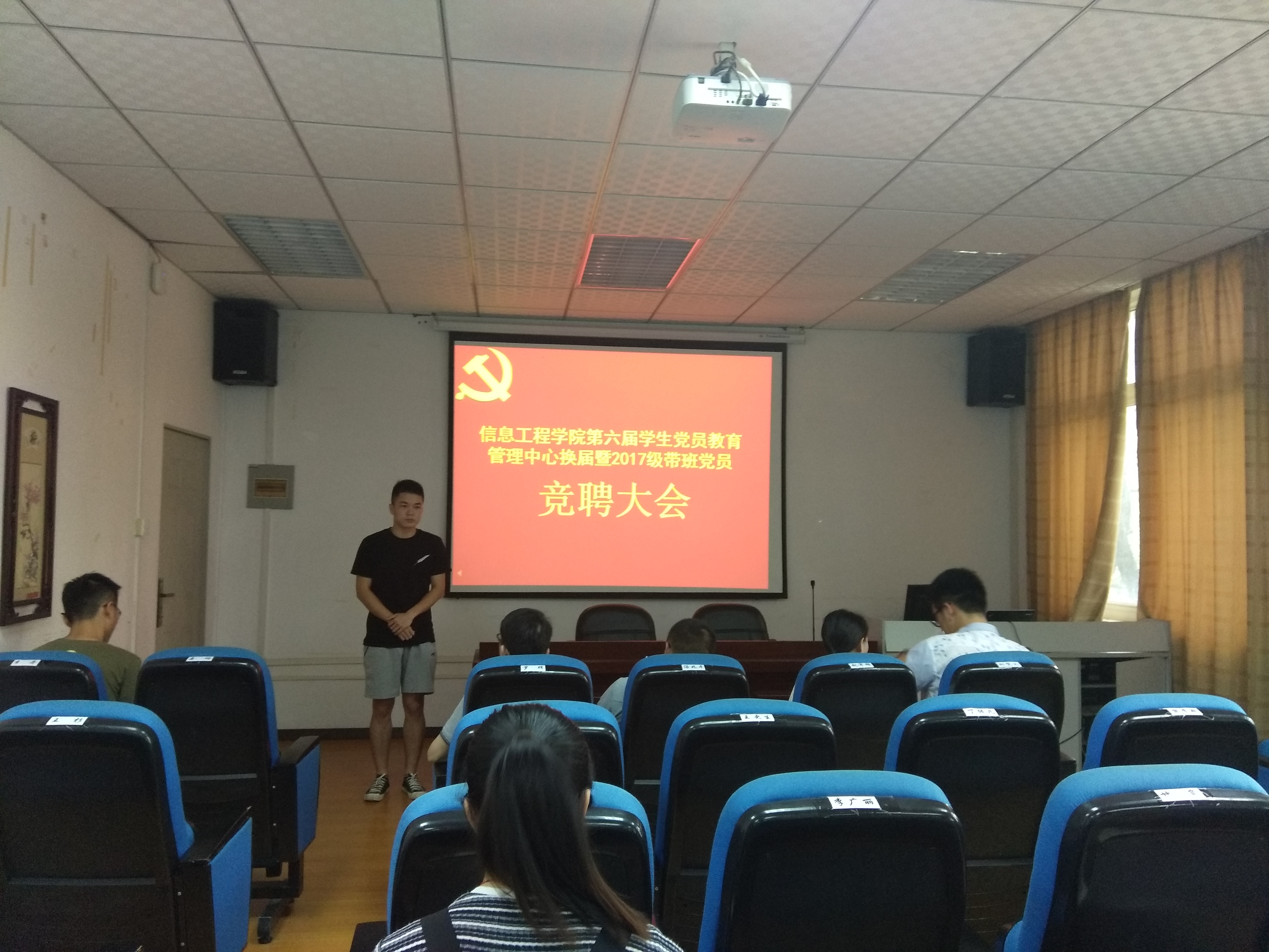 为建立一支政治素质好、工作能力强、管理水平高的学生党员干部队伍,6月7日,信息学院于教4栋307室召开第六届学生党员教育管理中心换届暨2017级带班党员竞聘大会,信息学院党委组织员黄清华、学工办主任兼团委书记陈文锦、学工办副主任兼团委副书记杨青、辅导员王一杰出席大会并担任评委。