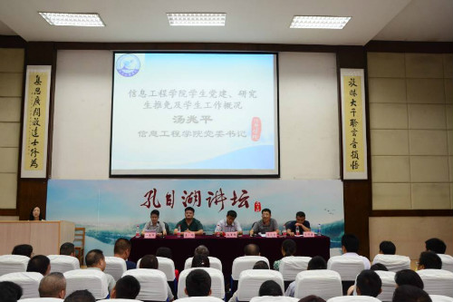 9月2日,信息学院在图书馆202室举行了2017级新生家长见面会。信息学院院长赵军辉、党委书记汤兆平、副院长姜楠、院长助理王传云,党委组织员黄清华及学院新生辅导员出席会议,会议由黄清华主持召开。