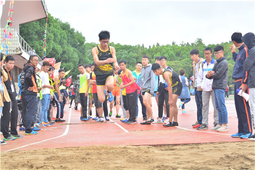 田径场上各学院院旗飘扬,加油助威的口号声此起彼伏。随着裁判挥动手中的红旗,跳远比赛正式开始。参赛选手们双眼坚定的注视着起跳线。2530号选手周子文助跑、踏线、跳跃、落地,一系列动作行云流水,一气呵成,宛如一道优美的弧线。