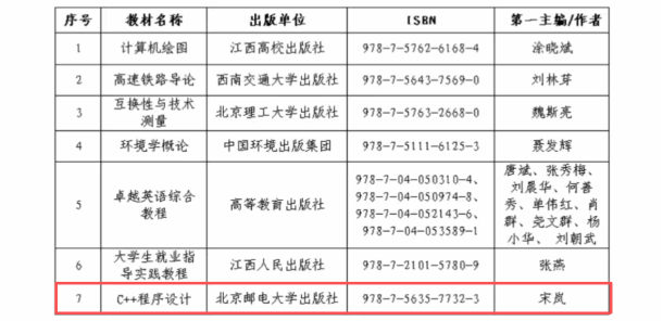 近日,江西省教育厅发布《关于公布江西省普通高等教育本科省级规划教材入选名单的通知》(赣教高字[2026]7号),69成人小说 宋岚老师主编的《C++程序设计》成功入选第二批江西省“十四五”普通高等教育本科省级规划教材。
