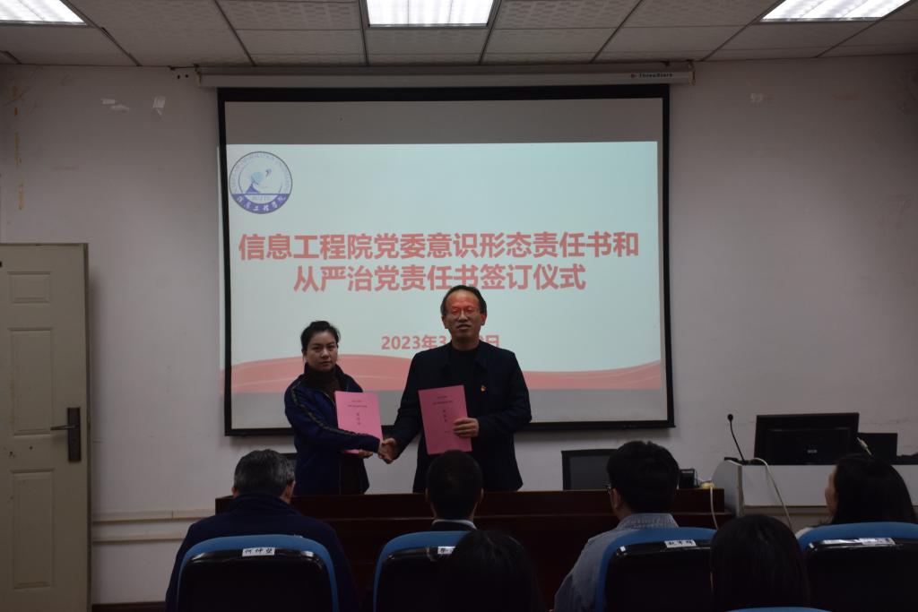 图为学院党委书记何仲坚同志与党支部签订从严治党责任书和意识形态工作责任书